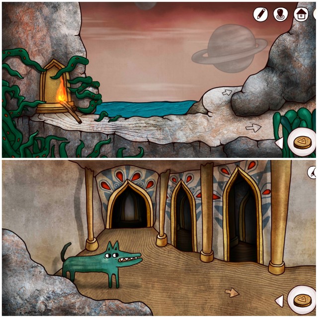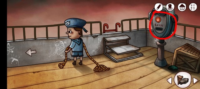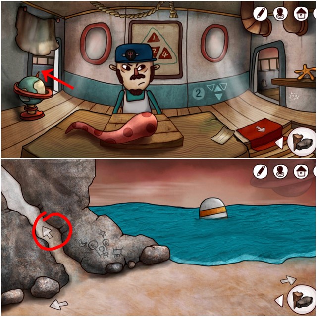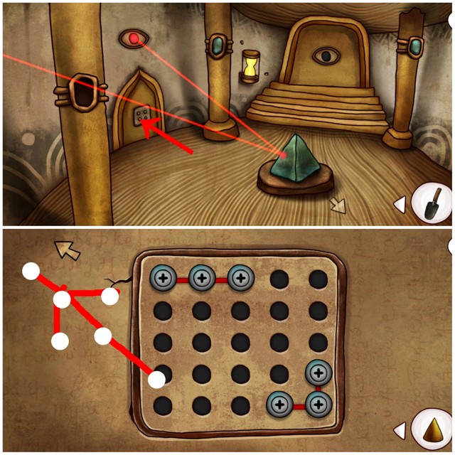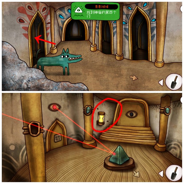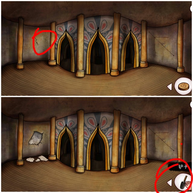 点击最左边的门,可以看到墙上有裂痕,我们多点几下裂痕就可以拿到铲子啦~ (当然我们右边的图案也会有用)