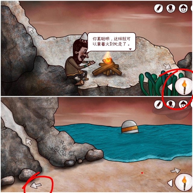 然后找到木棍点燃,它会进化成火把哈哈。再跟着箭头走