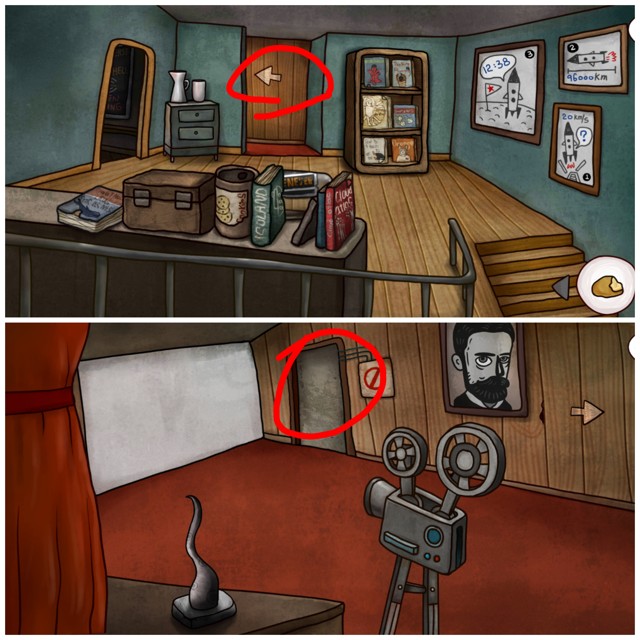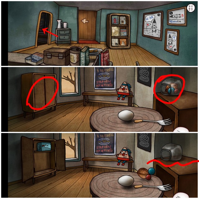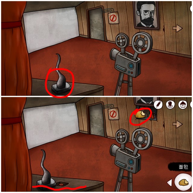 然后我们又往楼梯上边走,回到放书的那个小房间。然后去标有箭头的木门里面取面包(点击圈出来的那一坨东西,我们给它挪开,墙上的画就会被触发按钮。再点击画后面的东西就可以取出面包了)