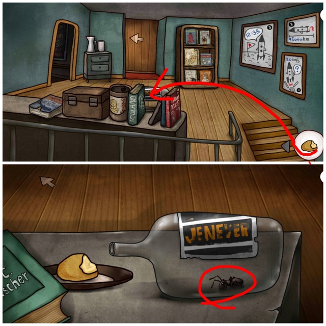 顺着箭头走回去。大家有没有注意到书后面有个小瓶子,点击瓶子。把面包放在瓶子前面的盘子里面,吸引蚂蚁出来,蚂蚁出来后就把它收集起来~(蚂蚁get)