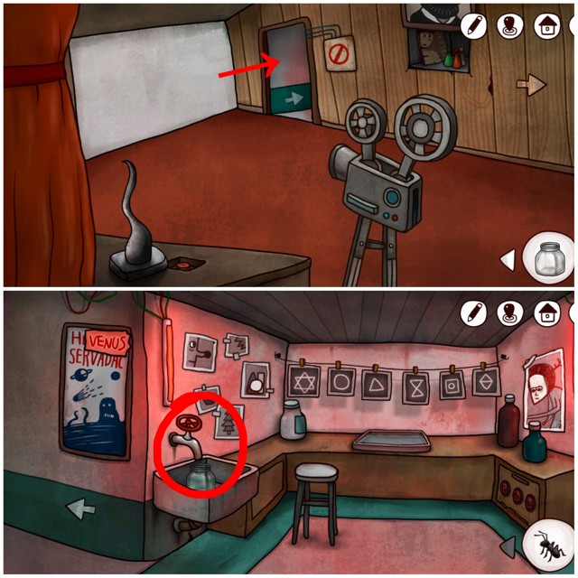 接下来我们出发去另一个房间。点击木柜和瓶子,收集空瓶子。