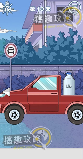 将禁止停车牌放到杆子上,然后在卡车后面拿到液氮罐。