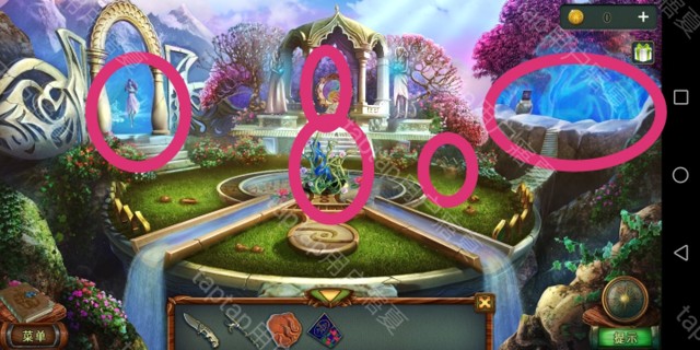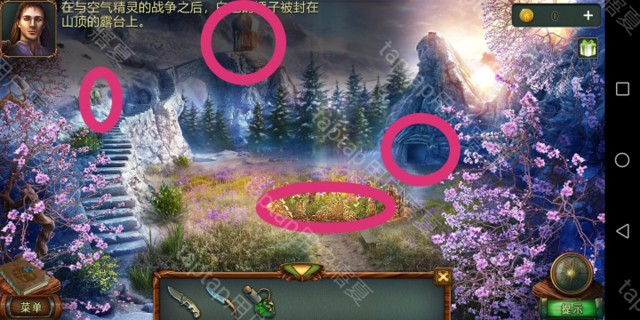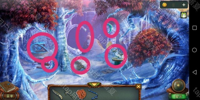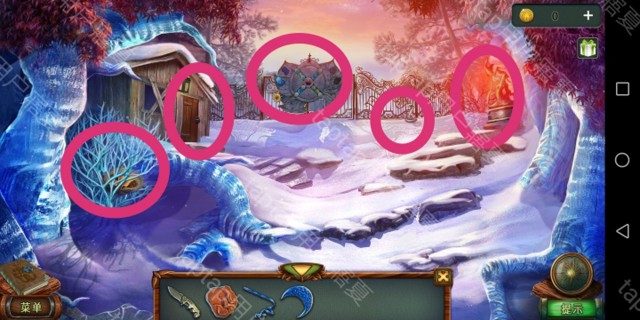 右侧台上放入火之石,充能后拿走,房子的门框上拔下钉子,点开,点钉子末端,使其弯曲,再绑上蓝丝带,得到绑着钩子的丝带,中间的铁门得太阳符号