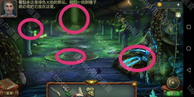 太阳石放到山顶右侧洞穴,得瓷莲花,集齐后放到左侧露台,完成小游戏后得白锤子放入洞穴中央绿光处