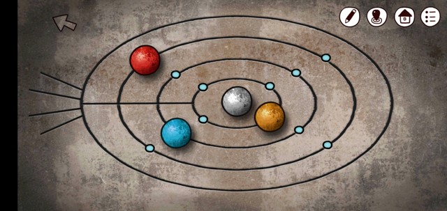 进入中间门,点击飞起来的球,这几个球的摆放方式和线的位置是根据二楼右边场景桌子上散落的东西颜色和叉子位置,位置是:
