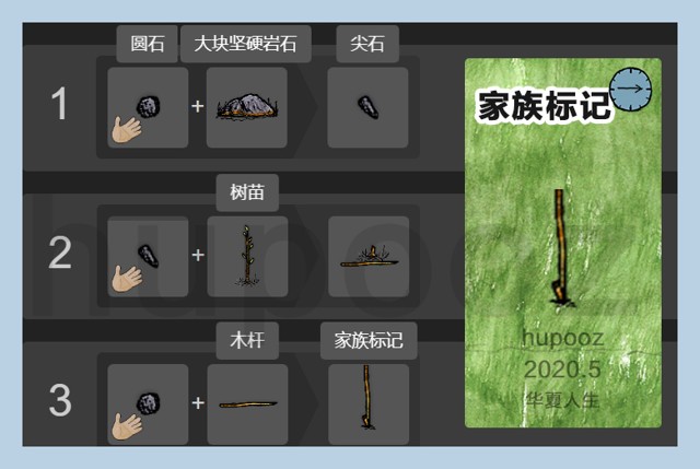 家族标记 = 树苗 + 尖石 + 圆石(绿草地上会有一根竖棍棍“树苗”,用尖石割下来,拿起放在空地上,再用圆石敲一下)