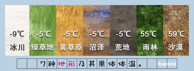 ② 地形:沙漠和雨林非常热,冰川很冷,其他地形折中。