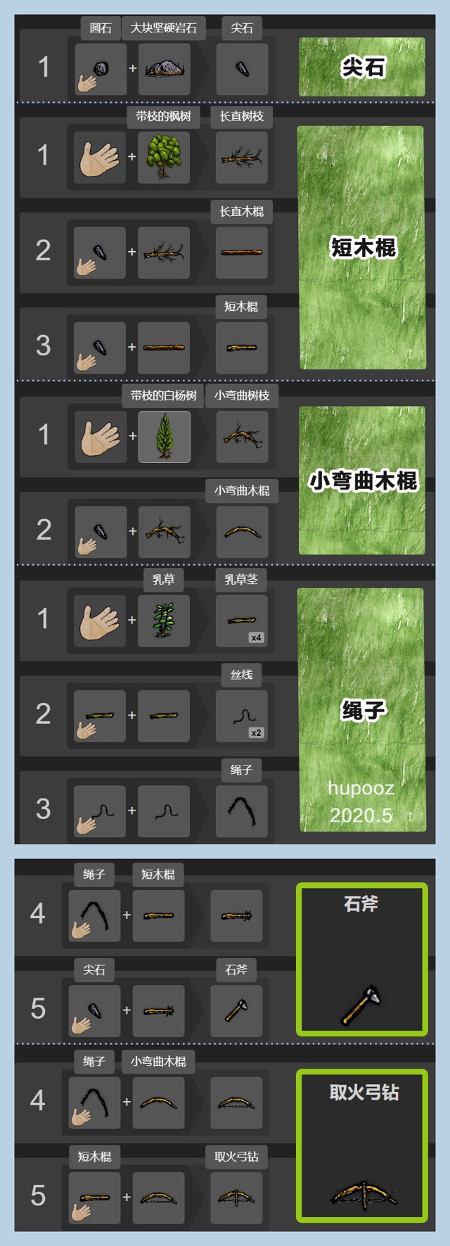 ① 引火柴 = 石斧 + 各种树枝(直的、弯的、紫杉树枝都行)