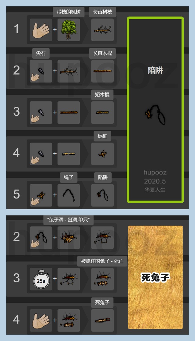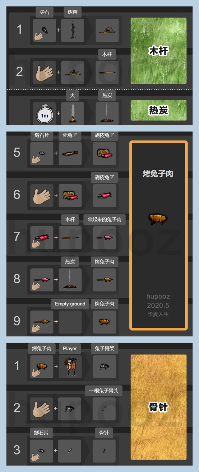 剥皮兔子 + 木杆 + 热炭 = 烤兔子肉(10点饱食度)