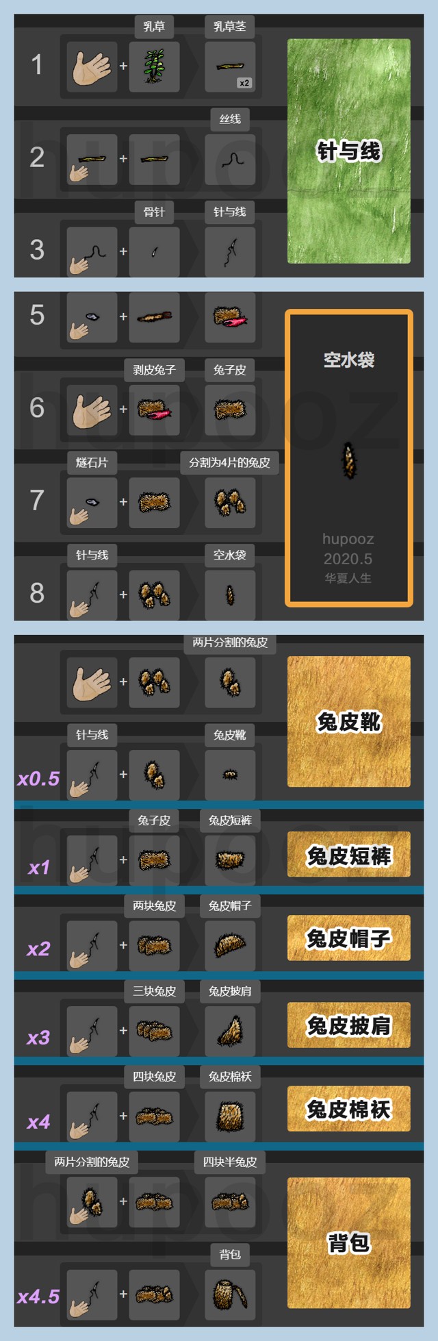 水袋 = 分割为4片的兔皮 + 针与线(线是消耗的,针永久可用)