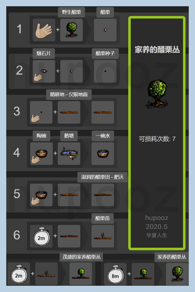 醋栗种子 + 精耕地 + 一碗水/一水袋水 → 等待12分钟,长成家养的醋栗丛