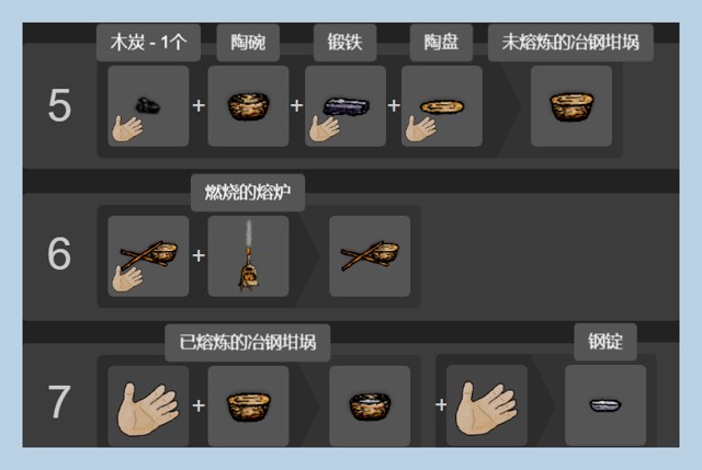 · 拿起木钳,夹起那碗“未熔炼的冶钢坩埚”,往燃烧的熔炉怼一下,再放在空地上,等10s,掀开盘子,用手从碗里取出“钢锭”~~~技能GET!