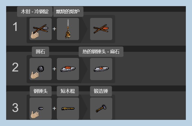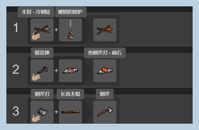 · 马上把它放在扁石上,用“锻造锤“敲一下(一共敲了1下),得到①热钢斧刃(钢斧的头部)