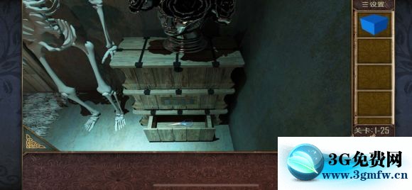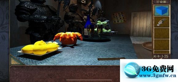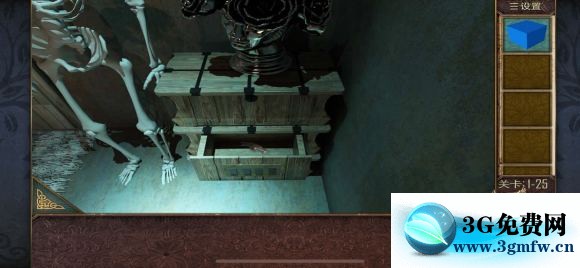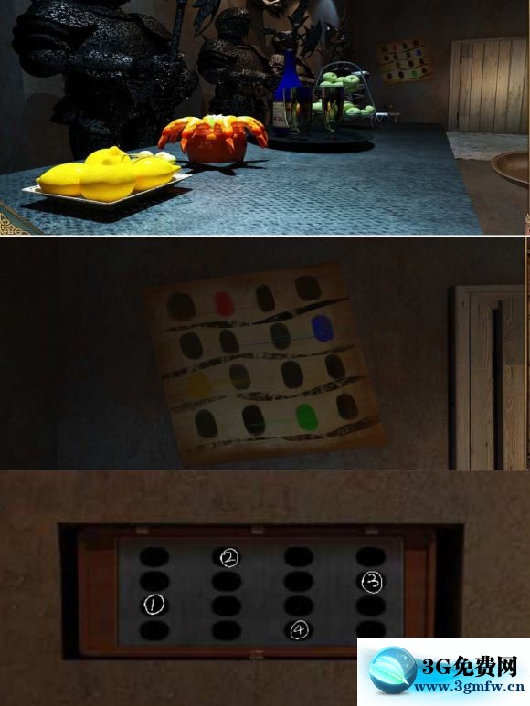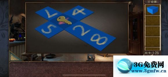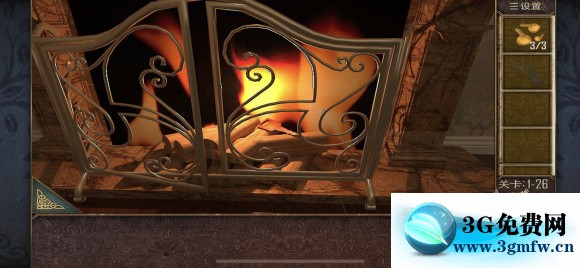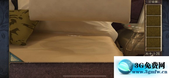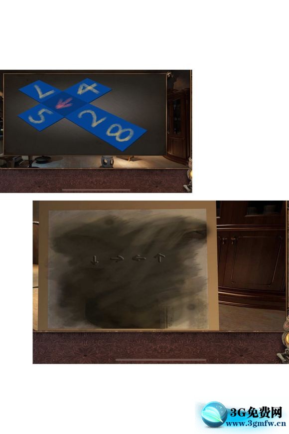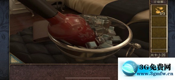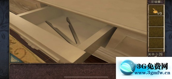 关卡1-26 枕头下面拿到抽屉把手 安在抽屉上,打开获得一把钳子 夹出火炉中的钥匙,放入放着红酒的冰桶里冷却,打开抽屉,里面有一个盒子,收集三个小圆(图六)拿到提示,根据图七中和线索得到密码:9426,打开镜子后面的密码箱,拿到房卡!