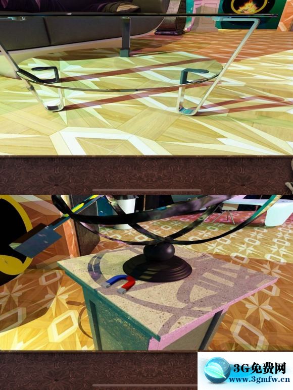 茶几桌角处拿到一根线,小柜子上拿到一个吸铁石(组合一下)