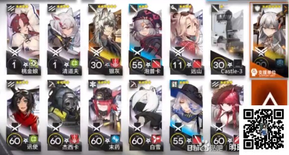 高台用到2个aoe,1个对空狙,1个治疗重装,1个远卫和一个打多近卫,1治疗,1减速辅助,银灰和赛雷亚不是必要的,带1技能的拉普兰德和古米也可以,我这是录像的时候不方便找到助战。配队参考是:3先锋,1对空狙(右侧),2个群体高台,2个近卫,1个重装,1个减速辅助,1个远卫,1个打多近卫或者再带一个重装,如果右侧近战不是挡3的,最好再带个近战小车。(参考图上的6星不是必须的)
