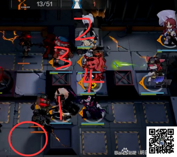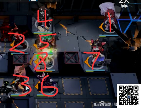 具体打法:先放桃金娘,然后2个挡2先锋,接着是对空狙向下(也可以打到下方先锋挡到的敌人),治疗重装,远卫,单体治疗,单体术士。第一波大波敌人过来的时候撤掉下路先锋换上黑角。