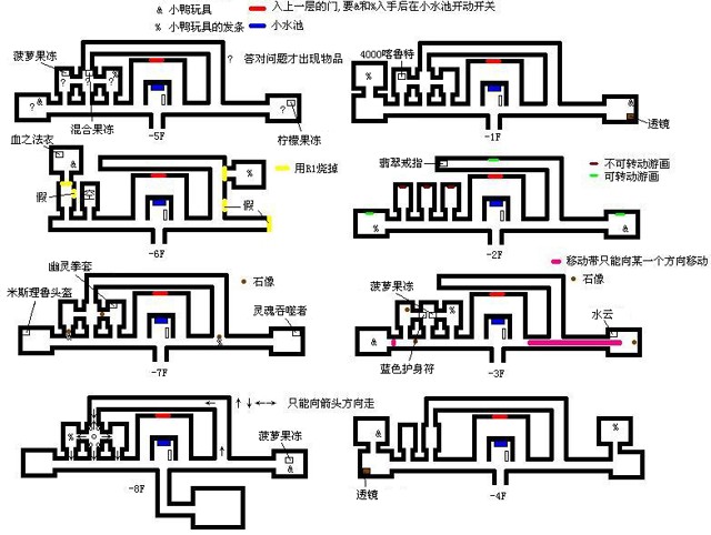 出来后进入迷宫,这迷宫挺有意思的,主要是把玩具鸭子(图中&位置)和发条(图中%位置)都入手后到小水池(图中蓝色处)就可以进入下一层。-1F完成后[BOSS战]