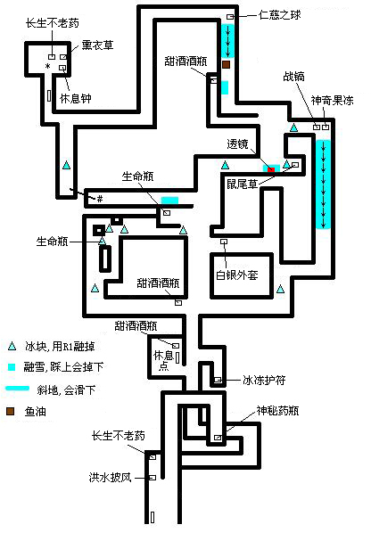 这里前进的路上挡路的冰块(图中△位置)可以用R1融掉,注意融化后出现的怪物往往会掉下道具鼠尾草(提升HP上限)。