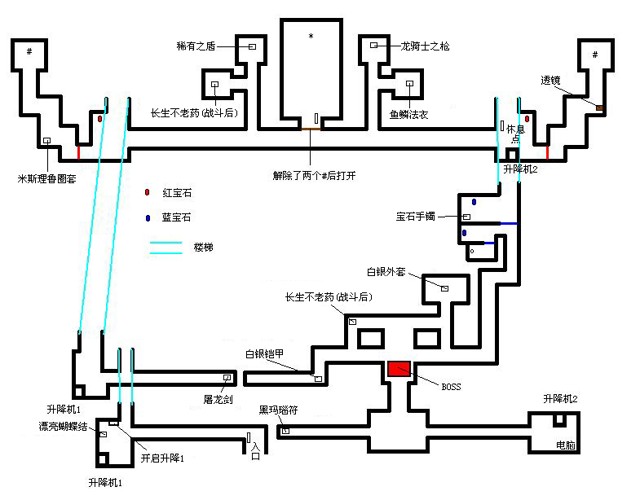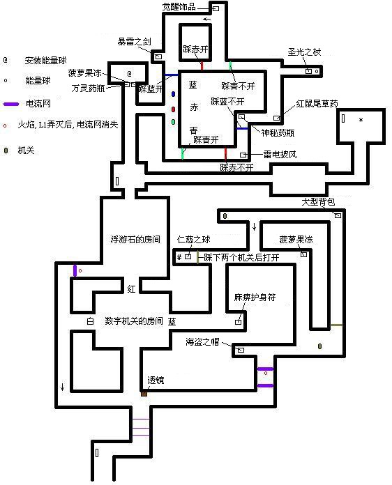 先在图中o的地方拿到白色磁盘。(用L1把蓝宝石变亮,使机械让开)继续深入看到一个挡路的怪物[BOSS战]。在图中有电脑的房间在电脑上插入磁盘。在到图中#处解除制御装置。(用R1把红宝石变亮,可以打开旁边的门)最后来到中央的大门(图中*位置)[BOSS战:剧情规定输]