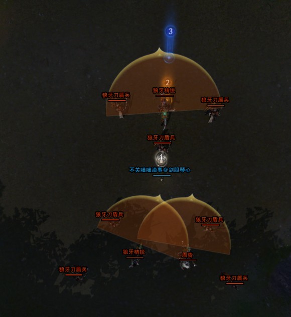 P2阶段,需主T将精锐定至4号点,冲锋时依次分配每个人去2号点挡冲锋(最好安排一个补挡的以防点到本应举盾的人),副T将周贽带至旁边(建议明教T生死劫可无伤),周贽T若做成就换T即可,建议T放在最后做。所有人依次挡住后击杀精锐将周贽压下50%进入P3。