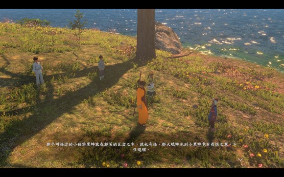 风景优美的桃花岛上,发现几个小孩在玩耍。
