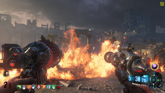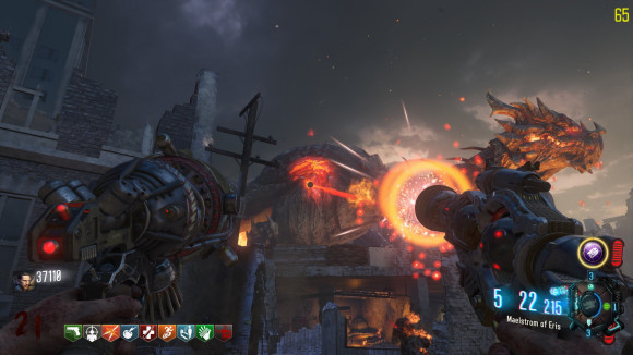 龙会在全屏幕放出火焰 只有地图的最前 最后两条 和侧面不分区域没有火焰 我们在火焰中可以掏出龙盾来为我们自己提供保护 龙还会吐出火球 也是使用龙盾就能防御