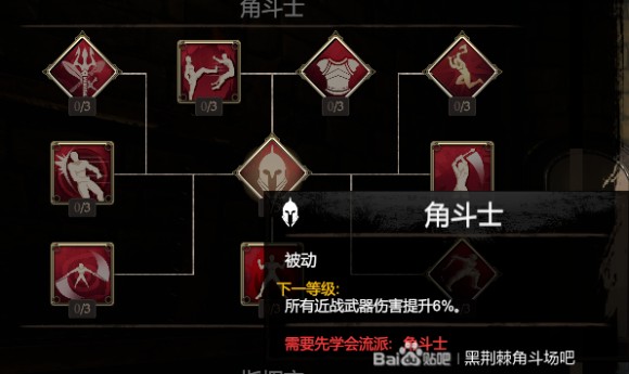 从被动的字面意思理解,就是增强近战输出,但相比远程必点的神射,角斗士这个流派选择空间其实蛮大的。开局的近战增伤相比神射的收益其实并不高(因为攻速快的近战伤害低,攻速慢的触发次数不多,而且近战打伤害的收益远远没有远程高),当然,单挑时很有用,而且目前来看很多的武器都有多余的点数去点这个被动。这个流派里有一个范围攻击,两个控制技能。