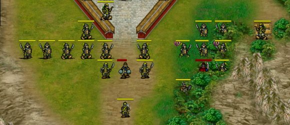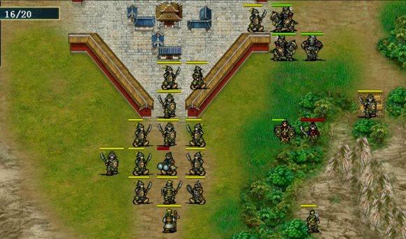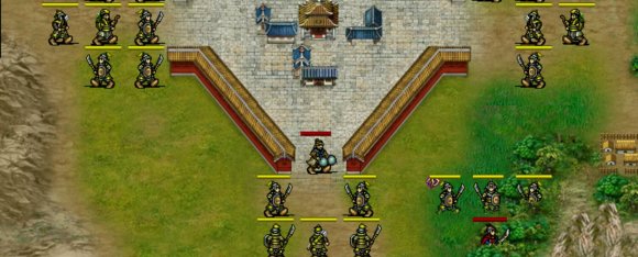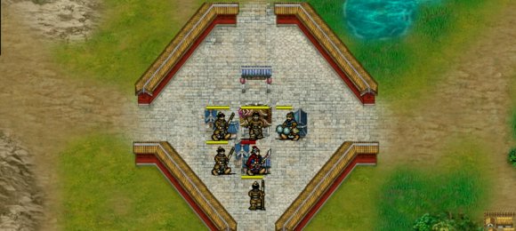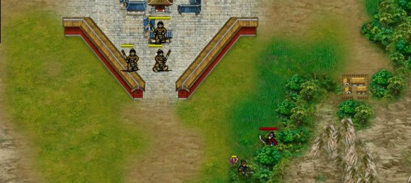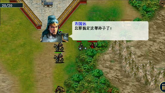 这关要把楼主打到自闭,输出严重乏力,没有买装备,楼主也是靠着运气过的,打法大家可以参考一下。开局齐国远站不动吃攻击果,保证反击击中粱师泰和下面的家丁并且不要致盲。第二回合攻击梁师泰保证双锏两次命中(最好sl暴击,我实在受不了梁师泰的格挡所以没管)反击下方家丁命中。第三回合sl暴击击杀下方家丁,然后出门往树林跑,第六回合击退粱师泰。然后黑如虎带兵围困四门,粱师泰先站城内(如图)吃防御果,然后下一回合向下两格吃武力果。11回合柴绍带援军出现(柴绍死了不用管,拉低输出的)尽量不要致盲敌人,不然输出不够(没想到老齐都技能有一天也会负面)最后全灭过关。