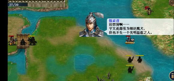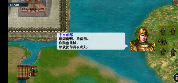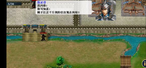 在三英拒群雄击退李元霸进入本关。开场往上走,伍云召记得加攻击。伍云召站到最上方城门触发剧情敌方小兵撤退一个,然后罗士信再去最上方城门触发隐藏剧情。之后罗士跑到右边湖里出现两水怪(鲨鱼),击杀完水怪之后完成隐藏条件,能力提升。伍云召去跑墓地(几个石头堆),跑完以后宇文成都出现,击退他过关。(为什么湖里会有鲨鱼