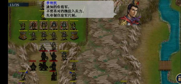 战前建议给罗成带金批令箭。开局我军被包围,第一回合罗成和另一个人去把刺客路堵死,下个回合罗成自己去堵(刺客会复活,所以不能杀)。马车跟着李密走,建议不要动。给马车加个防然后让弓兵控住一个能攻击到马车的小兵。其他人步步为营向前推进,杀一个兵,占一个位。优先击杀敌方枪兵,及峡谷两边弓箭手和医生。在李元霸10回合左右清光友军后,两回合后李世民出现在营寨后方提示敌军撤退,此时开唐四将就只会复活一次了。再两回合后胜利条件变为我军占领营寨过关。