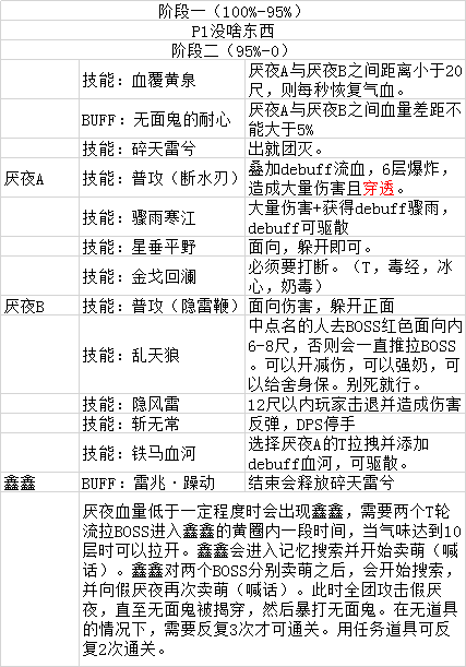 这个boss非常的吃站位,因为经常会吃到面向伤害。面向伤害非常高,容易造成减员。避开厌夜B的面向十分重要。而夜厌B还会对周围12尺释放击退。目前推荐的奇穴是点书离,需要靠近T10尺以内,故不建议去厌夜B的T附近,建议靠近厌夜A的T十尺范围内。在A的范围附近,掉血是比较少的。