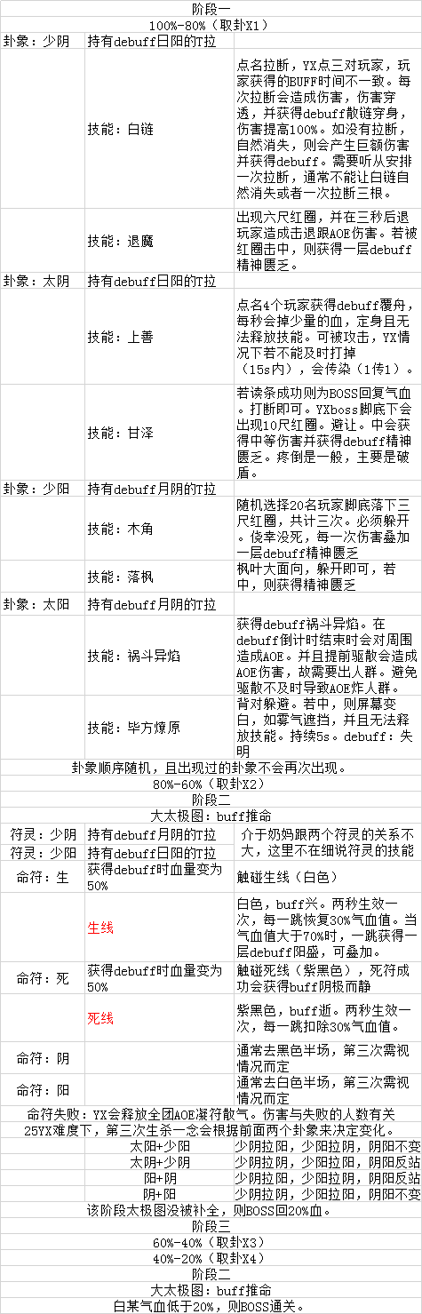命符一定不能错,命符错太多AOE炸团很厉害。但命符期间可以不停奶,奶谁都可以,不能奶的都被禁疗了。符灵的伤害都可以用月斜抗。只要指挥靠谱,知道怎么拉什么时候反站,太极图阶段跟PT没什么区别。这个时候走行气血流较为稳妥。