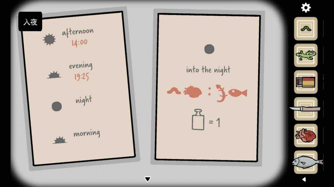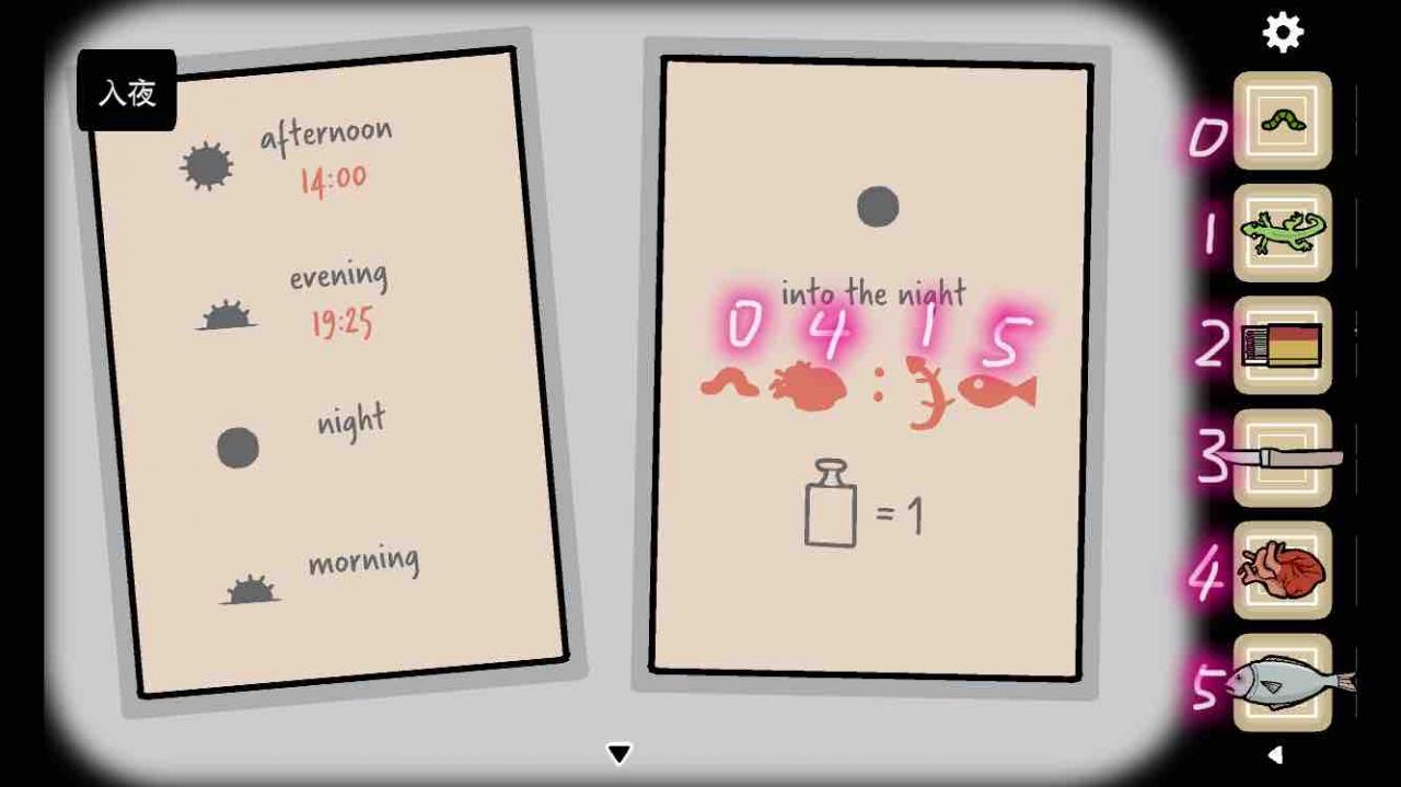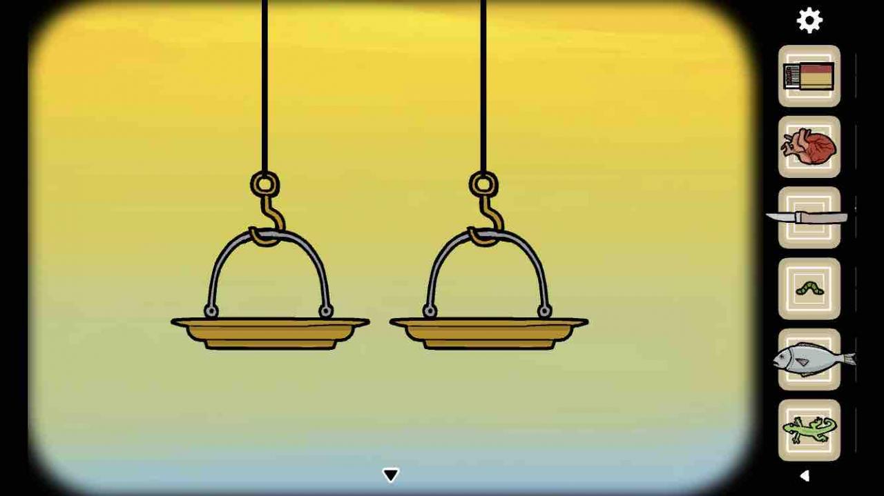 接下来进入第三个难点,也是本作最大的难点。使用【砝码】帮你的【虫子】【鱼】【壁虎】【心脏】称重量,【刀】和【火柴】作为辅助工具也可以参与进来。得到结果,虫子=0,壁虎=1,火柴=2,刀=3,心脏=4,鱼=5。排列顺序如图。