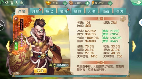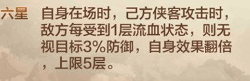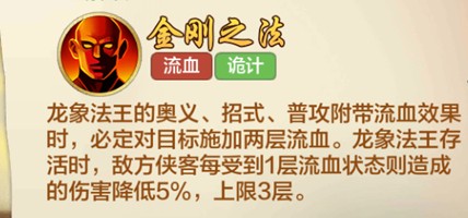 侠客中毒/流血时候,会在3回合内每回合自身出手结束后受到一定的伤害。比如我们曾经用过的庖丁解牛刀是流血3回合,攻击30%+内力20%。而龙象法王4星造诣龙象法王的奥义、招式、普攻附带流血效果(3回合)也是攻击30%+内力20%。光从系数上看,并没有任何出彩之处,但是毒血有个非常重要的特点,来源不同的毒血可以共存并且每一个各自都可以到3层。广大玩家们看到法王6星觉醒效果