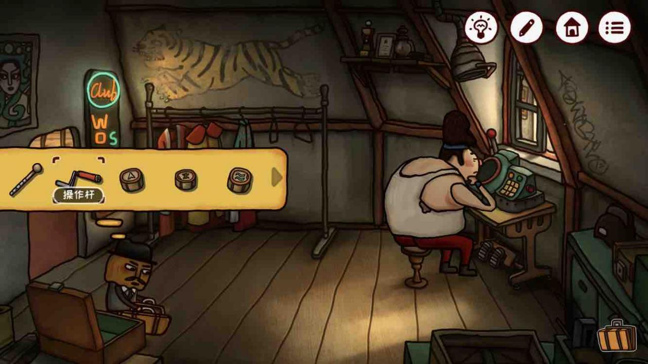 在房间的左下角有一个箱子,四个旋转按钮把指针调到中间的图形对应的方向就可以。得到【操作杆】