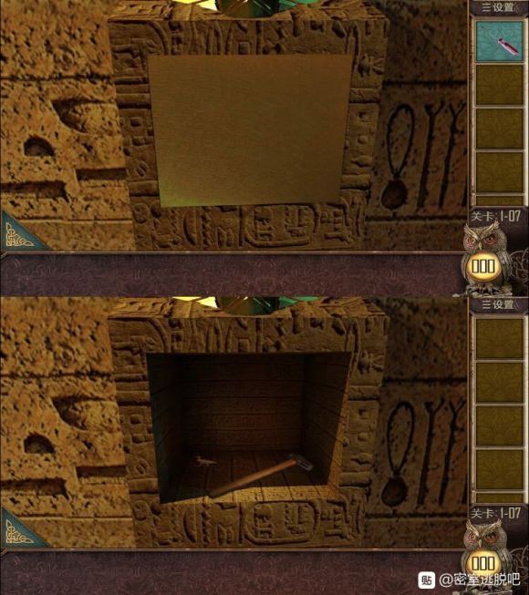第二步:用螺丝刀打开右边的石像里的暗格,的到锤子和一个小木雕