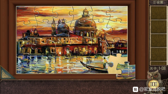 第一步:左侧衣柜顶部、大衣上、床上的托盘中一共得到3块拼图,拼图完成图如下