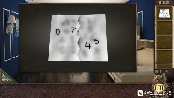 第三步:左边墙上和床头枕头下得到纸条,滴入药水得到数字0745