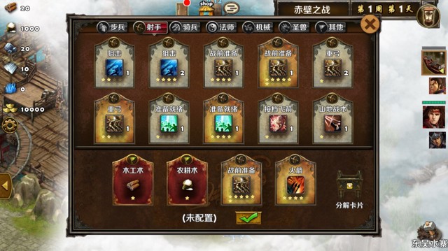 战术卡要求其实并不大(毕竟大佬的帖子摆在那我也不好多说什么),鹰卫三卡什么等级高上什么吧,我觉得一回合秒不掉所以折中带了个火箭,如果多次尝试不过也可以去肝一下卡等级。当然木工术是必须的因为要升级鹰卫,农耕术比炼金术更好因为地图资源少。
