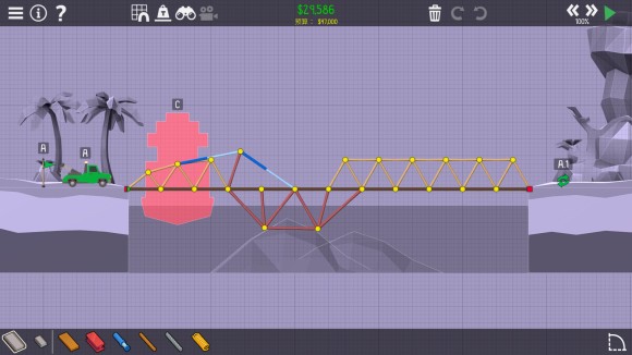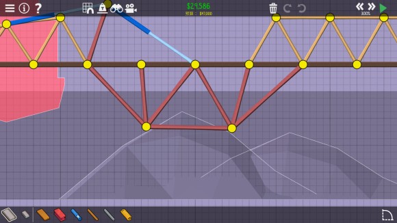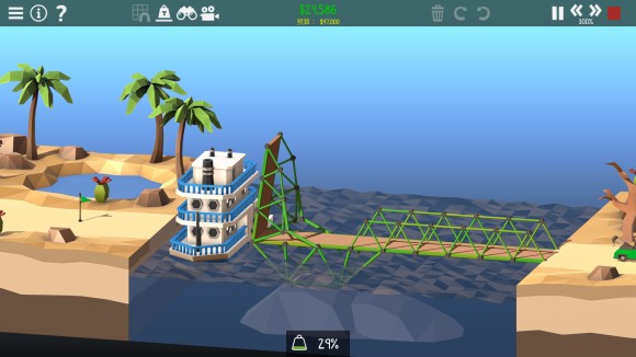 桥梁建造师2《PolyBridge2》4-1边缘行走攻略 总体如下,需要两段式液压把左边的路旋转90度左右才能避开船。 可以利用下面的石头当做支点。↓ 液压效果↓ 老友网www.andlaou.com免费为你分享