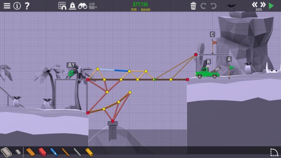 桥梁建造师2《PolyBridge2》4-12绝尘而去攻略 这关思路很简单,因为C的速度足够快,A过去之后把A的路中间打开让C飞上去就可以了。 液压效果↓ 老友网www.andlaou.com免费为你分享