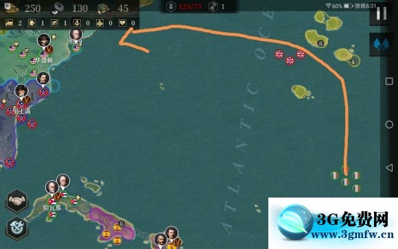 舰队快速打小那三艘船后打下岛屿,然后前往北美协助美国,这里可以上一个海将,西班牙下方的舰队不用管,一般会直接南下打我们的根据地,至于后面出现的英军舰队支援,可防可不防,稍后再解释