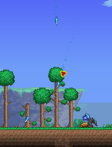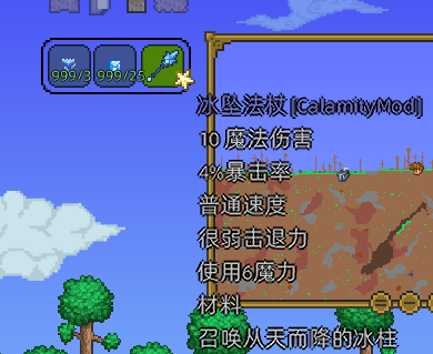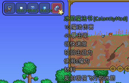 而如果前期你找到了书架亦或是到地牢门口挖了几本书做了书架,你还可以选择用冰块、雪块、寒颤棘、水桶做一本冰箭魔法书,效果比冰坠好使很多