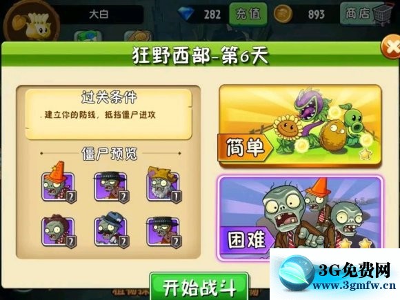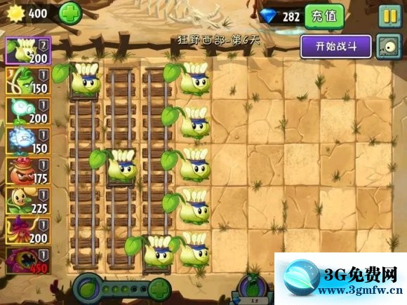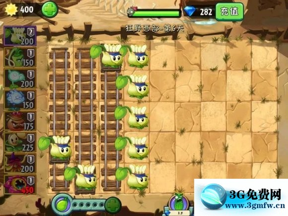 新手攻略:本关需注意淘金僵尸,最好能在一开始就杀掉,尽量不要让他飞到左边,双向射手不是必须的。如果输出不够可以考虑给植物进行升阶,但是全一阶有解