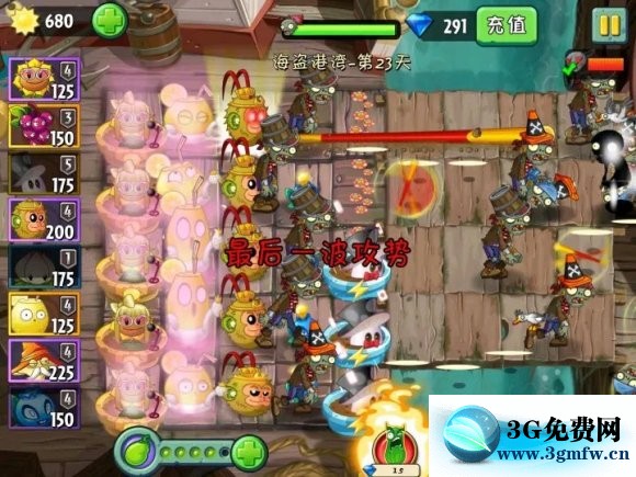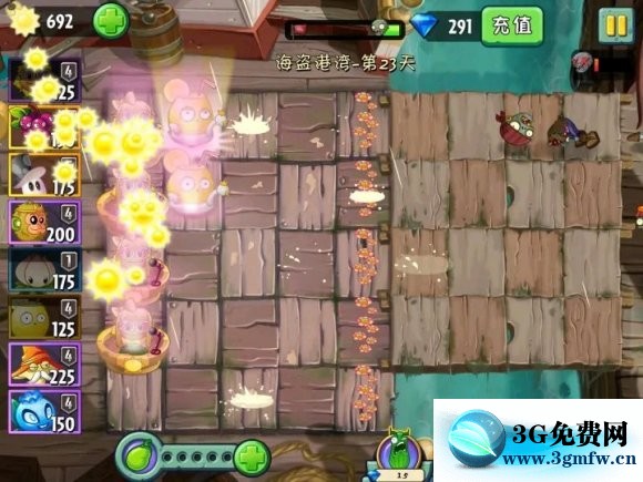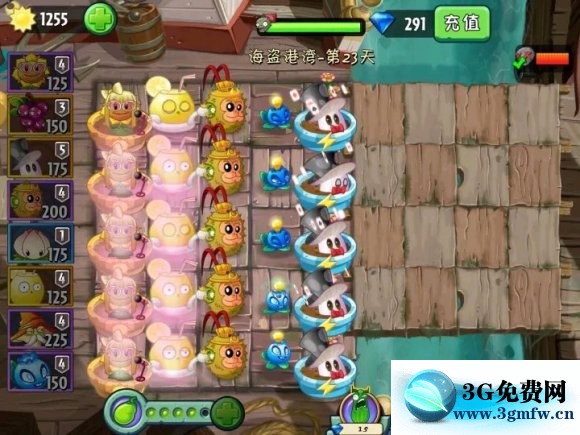 新手攻略:等海鸥僵尸出来就用三叶草,数量凑不够就给卷心菜使用能量豆。可以在花坛上种植坚果,防止僵尸越界