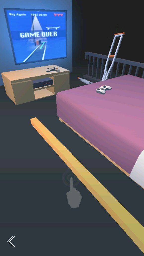 他醒来了,发现他回到了家里,他在家中打游戏(?)显然是滑板游戏__他的人生道路。游戏结束,这条路恐怕走不下去了。