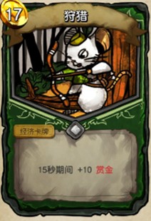 特有的经济卡牌 (改版添加):狩猎;使用后在15秒内,每击杀一个敌人获得额外10金币的赏金,去消耗17金币 击杀最少2个敌人才可盈利