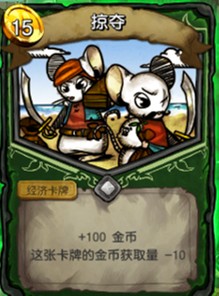 特有的经济卡牌 :掠夺;首次使用获得100金币,每次使用获得金币数递减10金币,消耗15金币 最多盈利85金币……使用数次后,金币获得量减至0,亏15金币。