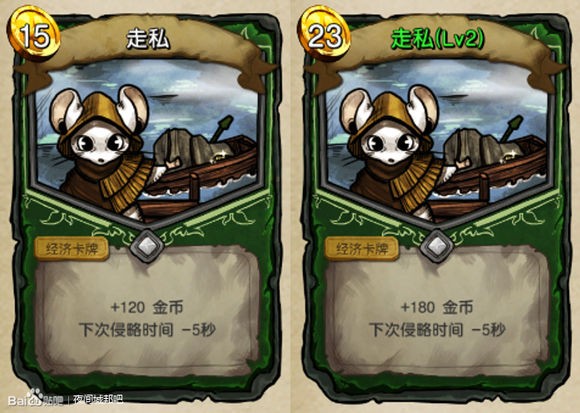 卡牌: 走私;经济卡牌。遇到此卡不要选它,选了也不要用,用入侵周期-5s兑换120金币/180金币,哪个经济卡比不上它呢?不过如果为了更快敌人入侵,用一用也未尝不可